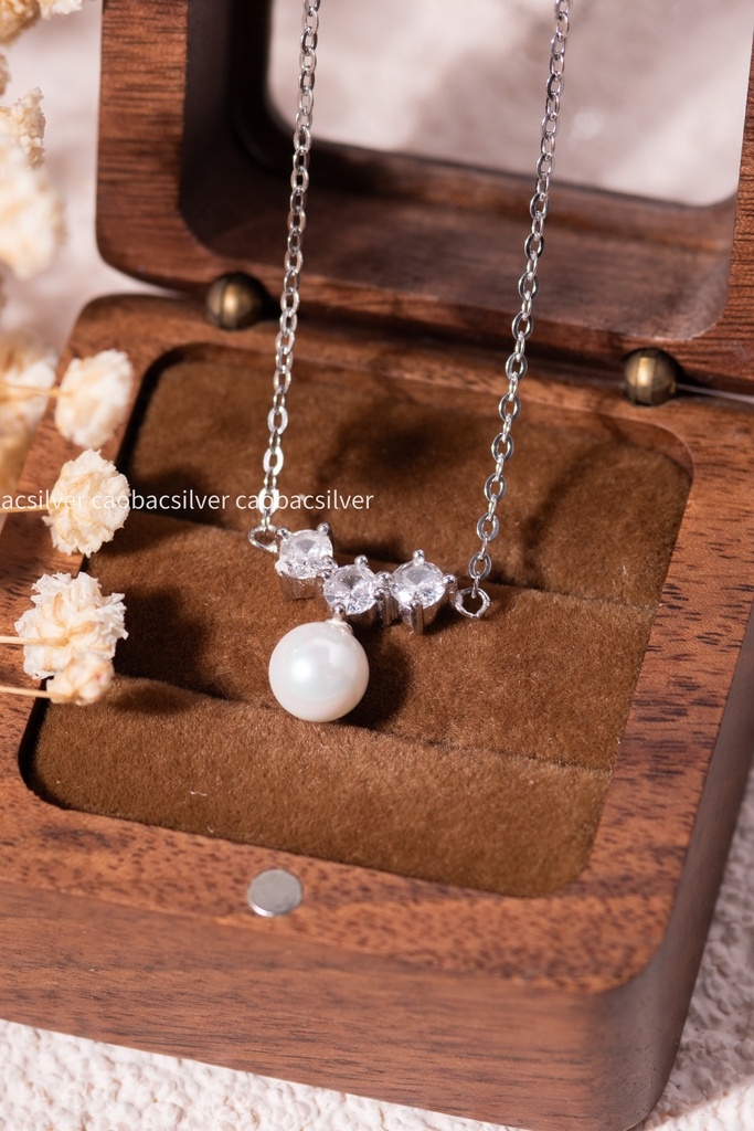 Dây chuyền bạc Việt Nam, chế tác thủ công tinh xảo, đính đá CZ cao cấp, mix cùng Ngọc Trai Nước Ngọt tự nhiên được chọn lọc kỹ lưỡng từng viên một, tuy nhiên vì là ngọc trai thiên nhiên nên vẫn có đôi chút vết sinh trưởng chứ không thể tròn đều bóng mịn 100% như hạt trai nhựa.