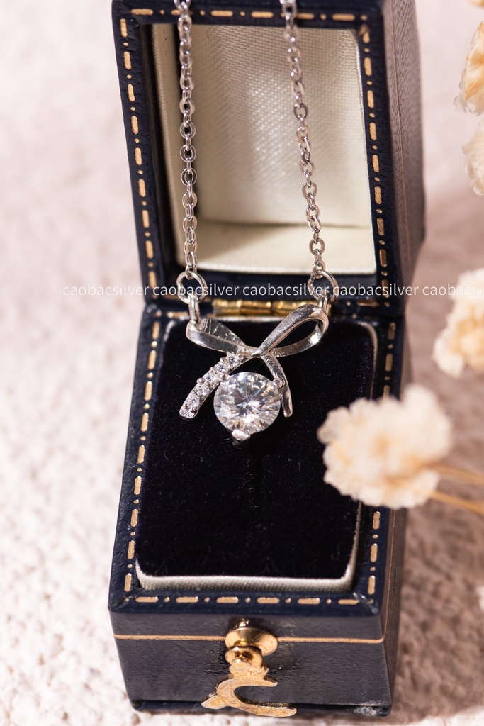 Dây chuyền bạc Việt Nam xi vàng trắng đính kim cương Moissanite nhà Cáo được làm từ chất liệu bạc Việt Nam được chế tác thủ công theo tiêu chuẩn S925 quốc tế bởi thợ kim hoàn lành nghề, được phủ một lớp vàng trắng 18k bền màu, an toàn cho da; đá chủ là kim cương Moissanite có kiểm định đi kèm, y hệt 95% kim cương tự nhiên.