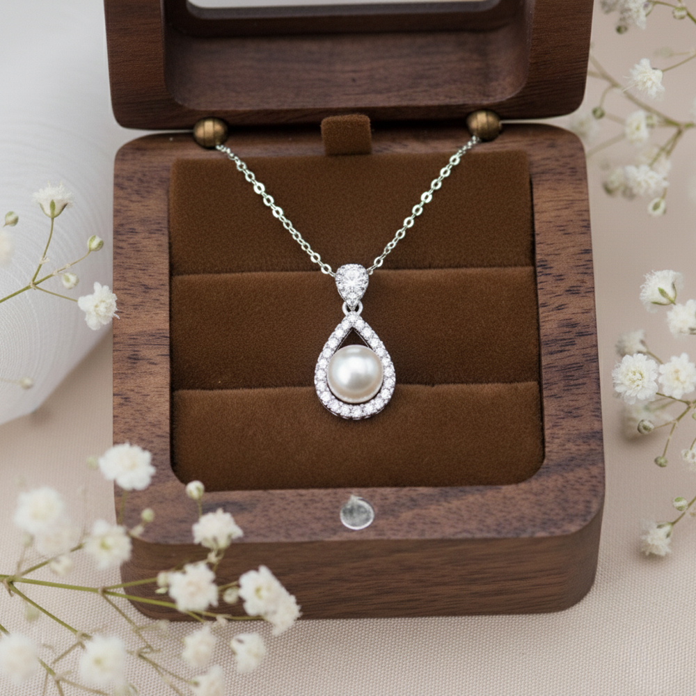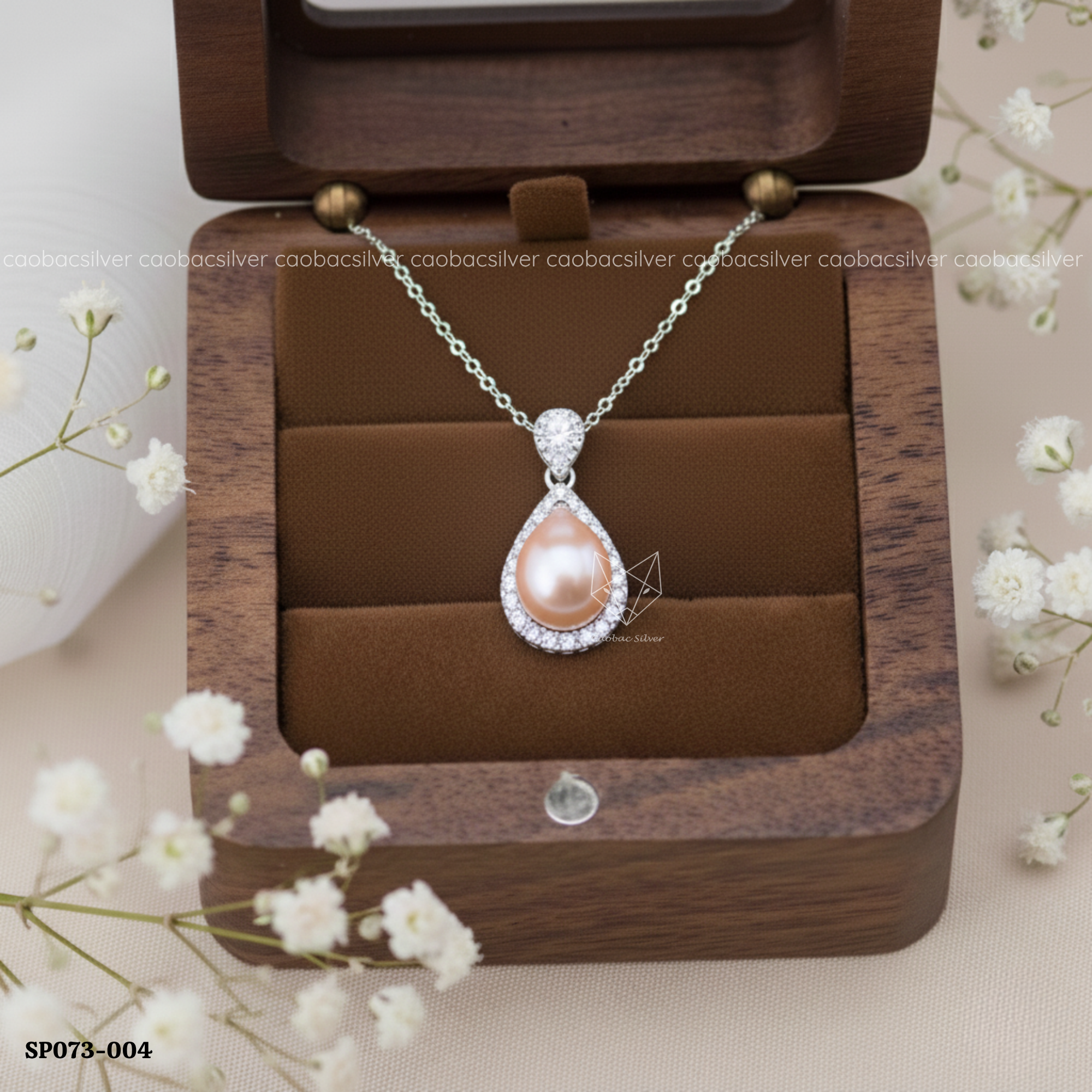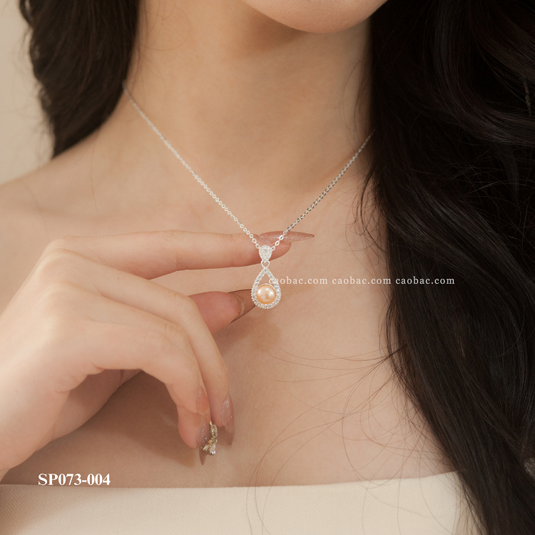 Dây chuyền bạc Việt Nam ngọc trai Freshwater viền đá tì bà gây ấn tượng với thiết kế mặt giọt nước mềm mại, thanh lịch. Viên ngọc trai tự nhiên tròn bóng được đặt làm tâm điểm, bao quanh là viền đá trắng lấp lánh giúp tổng thể vừa sang trọng vừa dịu dàng, dễ đeo trong nhiều hoàn cảnh.