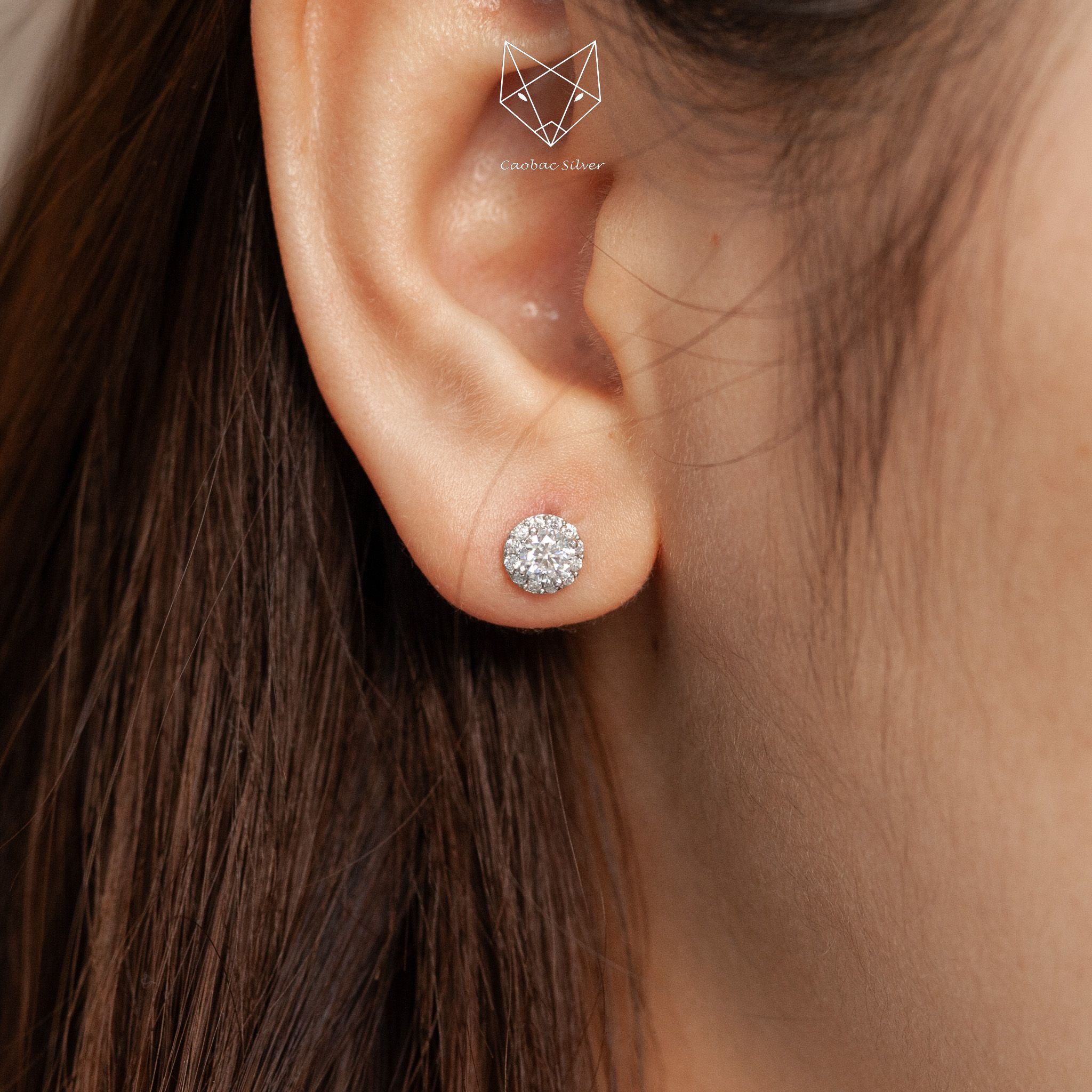 Khuyên tai bạc Việt Nam Tiny mang thiết kế đinh tán nhỏ gọn, tâm điểm là viên Kim Cương Moissanite 4 li lấp lánh, được viền halo đá tấm li ti giúp tăng độ bắt sáng tinh tế. Kiểu dáng tối giản mà sang nhẹ, ôm tai chắc chắn, đeo êm suốt cả ngày.