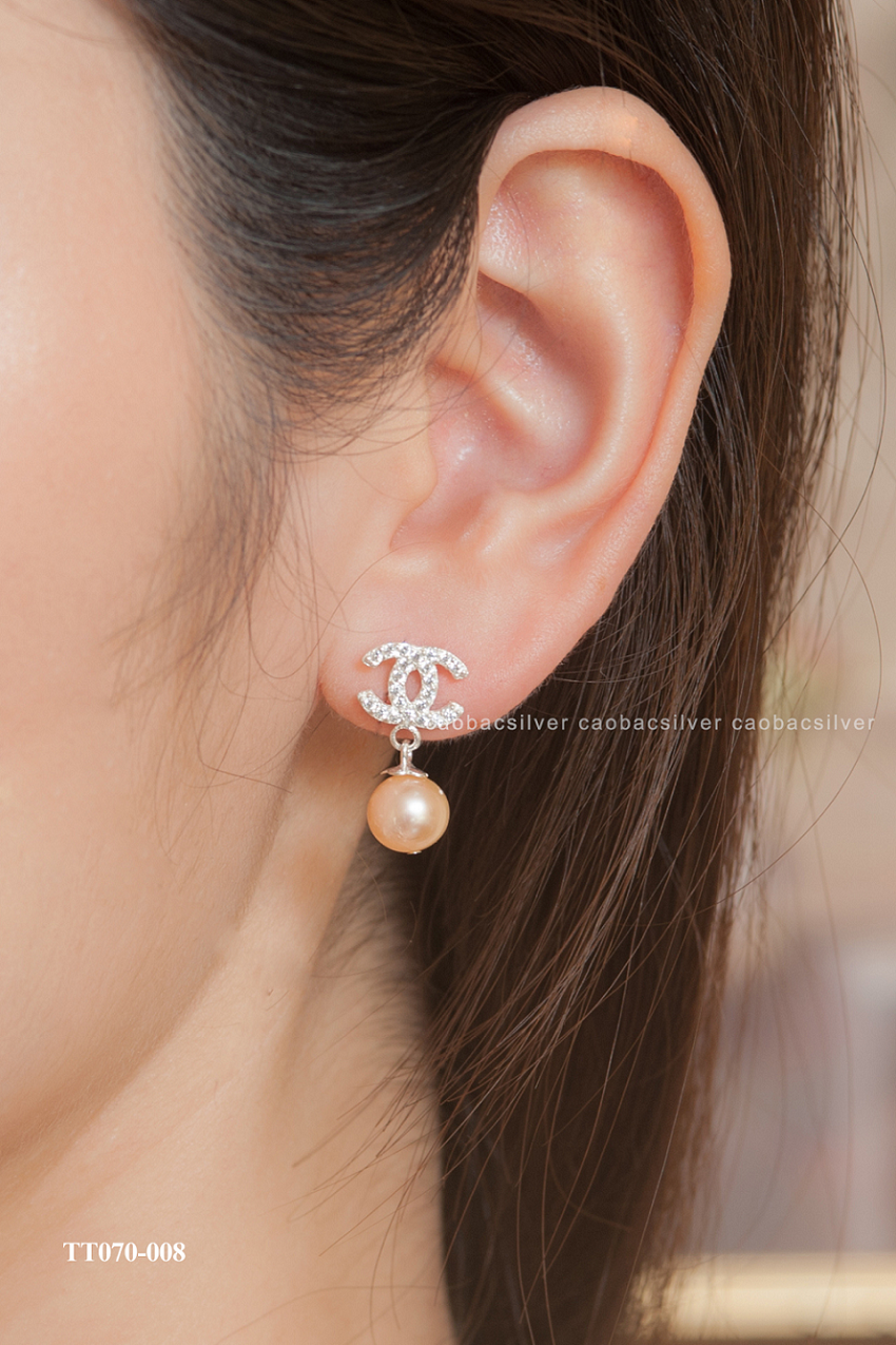 Khuyên tai bạc Việt Nam ngọc trai Freshwater Chanel gây ấn tượng với thiết kế logo đính đá lấp lánh, kết hợp viên ngọc trai tròn đều ánh bóng tự nhiên. Kiểu dáng thanh lịch, hiện đại, dễ phối cùng trang phục công sở lẫn váy dự tiệc, tôn lên nét sang trọng cho người đeo.