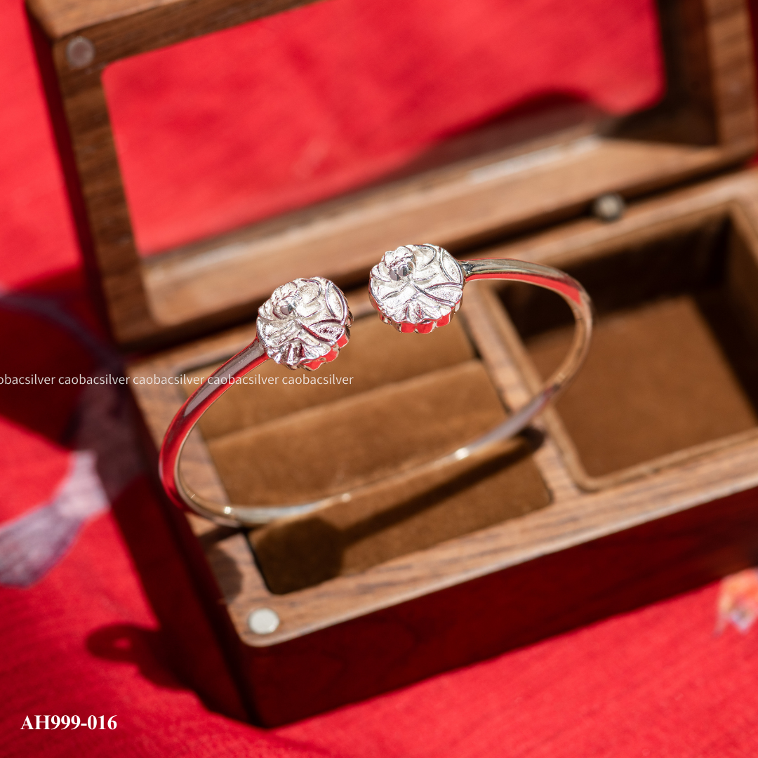 Kiềng tay bạc Việt Nam Vọng Nguyệt hoa sen là thiết kế mang đậm nét truyền thống Á Đông, lấy cảm hứng từ vẻ đẹp thanh khiết của hoa sen – biểu tượng của sự an nhiên và sang trọng. Sản phẩm phù hợp với những ai yêu thích phong cách cổ điển, tinh tế nhưng vẫn hiện đại và dễ phối đồ.