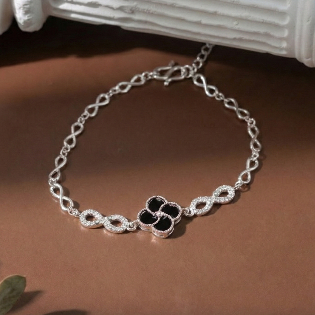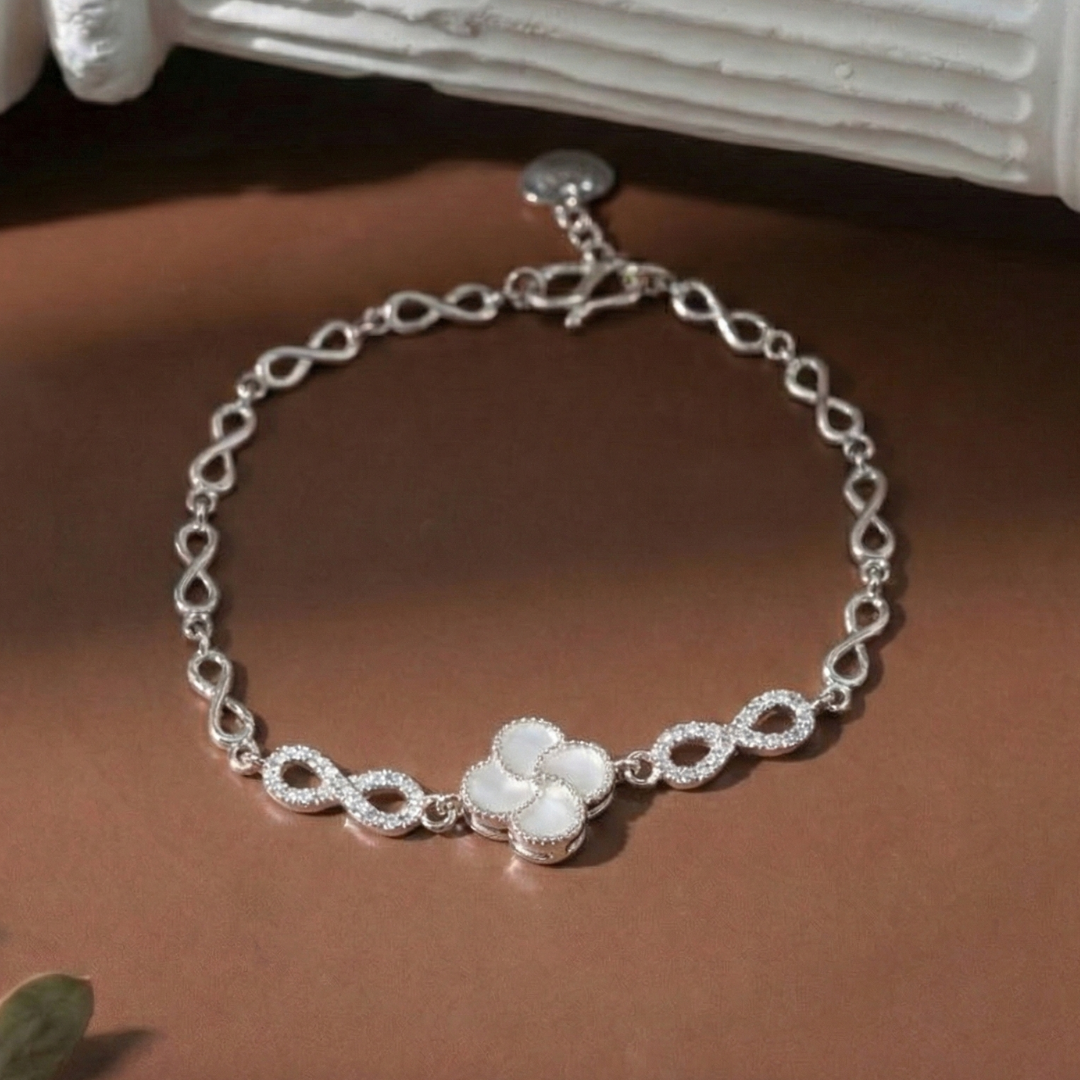 Lắc tay bạc Việt Nam bốn lá xà cừ vô cực đính đá sở hữu thiết kế dây mắt xoắn hình vô cực mềm mại, nổi bật với điểm nhấn bốn lá xà cừ viền đá lấp lánh, mang ý nghĩa may mắn và bền lâu, phù hợp đeo hằng ngày hoặc làm quà tặng tinh tế.