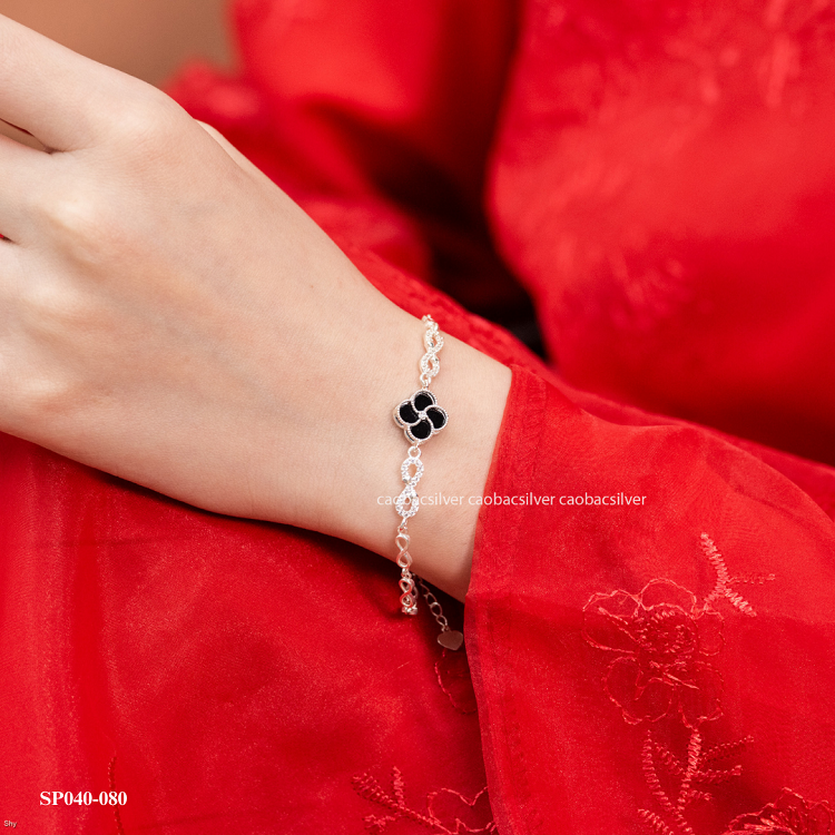 • Chất liệu: Bạc Việt Nam kết hợp đá đính chắc tay • Điểm nhấn: Bốn lá xà cừ (trắng hoặc đen) viền đá tinh xảo • Thiết kế: Dây mắt xoắn vô cực, form gọn nhẹ, nữ tính • Có thể chế tác theo size riêng của khách, kể cả cỡ bigsize