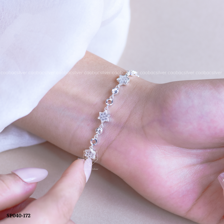 Lắc tay bạc Việt Nam chuỗi sao đính đá xen tròn phay mang thiết kế thanh mảnh với các ngôi sao nhỏ đính đá lấp lánh. Các mắt tròn phay sáng bóng được sắp xếp xen kẽ, tạo nên tổng thể nhẹ nhàng, nữ tính và tinh tế cho cổ tay.