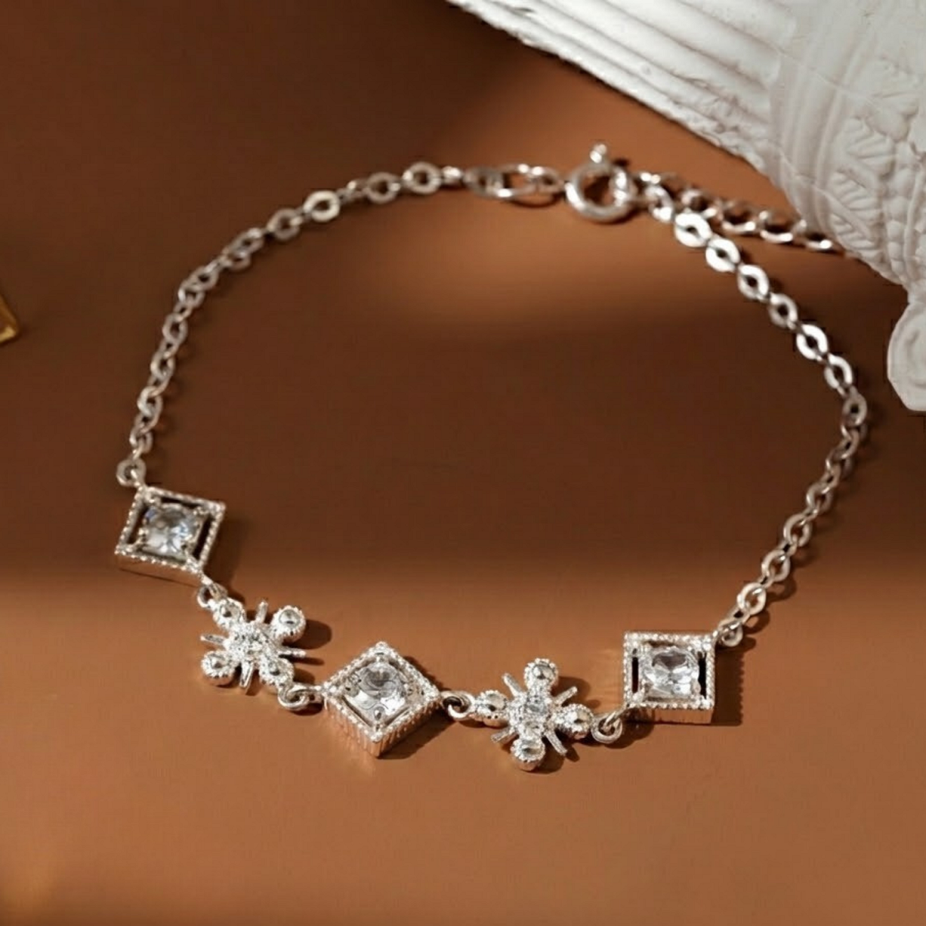 Lắc tay bạc Việt Nam hoa bốn cánh sole thoi đá sở hữu thiết kế thanh mảnh, nổi bật với các mắt hoa bốn cánh xen kẽ ổ đá dáng thoi tinh tế, tạo hiệu ứng lấp lánh nhẹ nhàng và sang nhã khi đeo.
