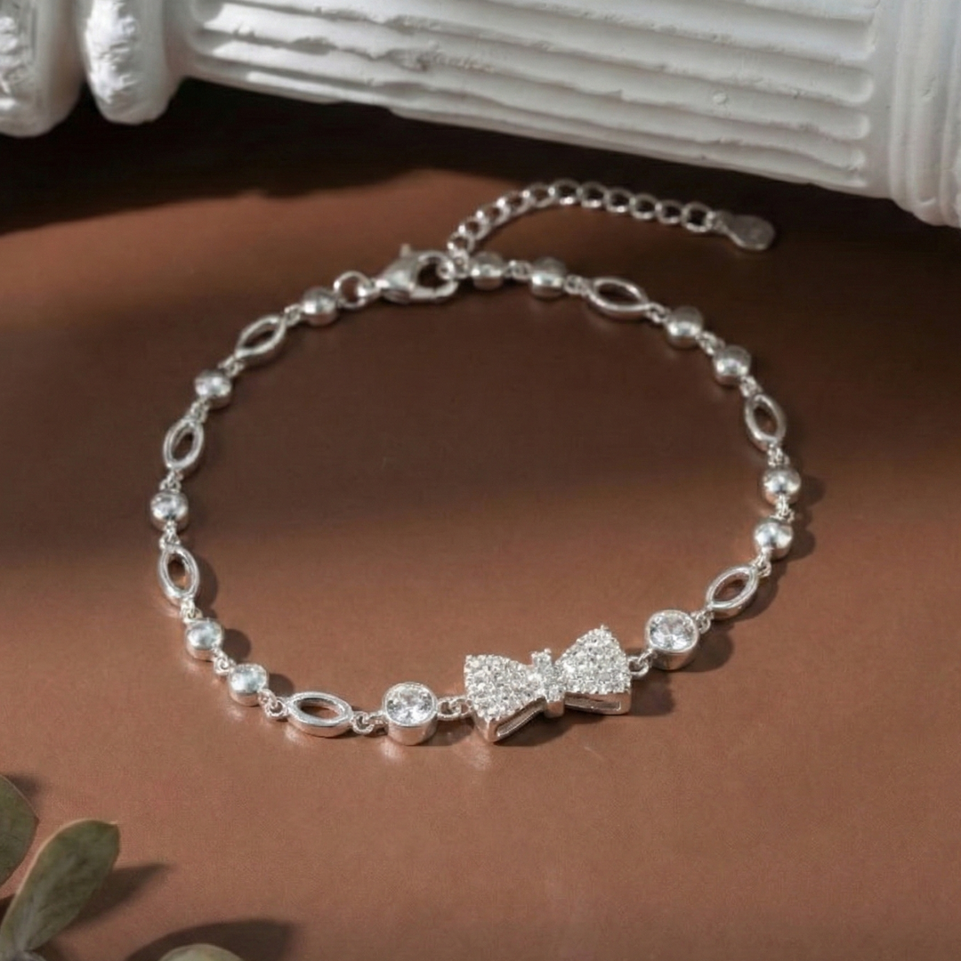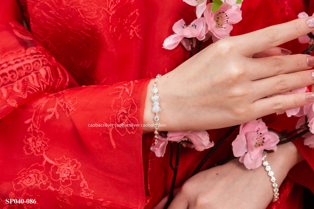 Lắc tay bạc Việt Nam nơ đính đá to gây ấn tượng với điểm nhấn nơ đính đá lấp lánh ở trung tâm, kết hợp chuỗi hạt bạc xen đá tròn tinh tế, mang vẻ đẹp nữ tính, sang nhẹ và giúp cổ tay nổi bật khi đeo.