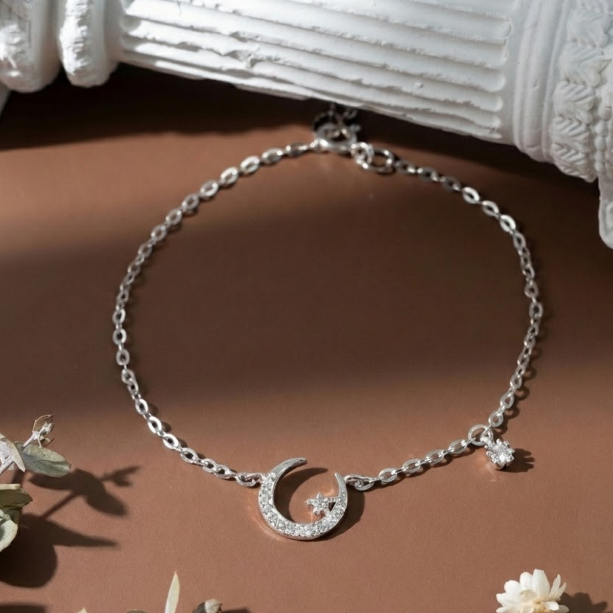 Lắc tay bạc Việt Nam trăng sao đính đá lấp lánh mang thiết kế dây mảnh nhẹ tay, nổi bật với mặt trăng ôm sao nhỏ đính đá tinh tế, tạo cảm giác dịu dàng và nữ tính, phù hợp đeo hằng ngày hoặc làm quà tặng ý nghĩa.