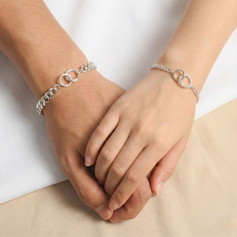 Lắc tay đôi bạc Việt Nam thiết kế sợi xích với dây mắt xích sáng bóng, điểm nhấn mặt vĩnh cửu gồm hai vòng lồng nhau tượng trưng cho sự gắn kết vĩnh hằng. Bản nam to mạnh mẽ – bản nữ nhỏ tinh tế, phong cách unisex, chắc tay và dễ phối hằng ngày.