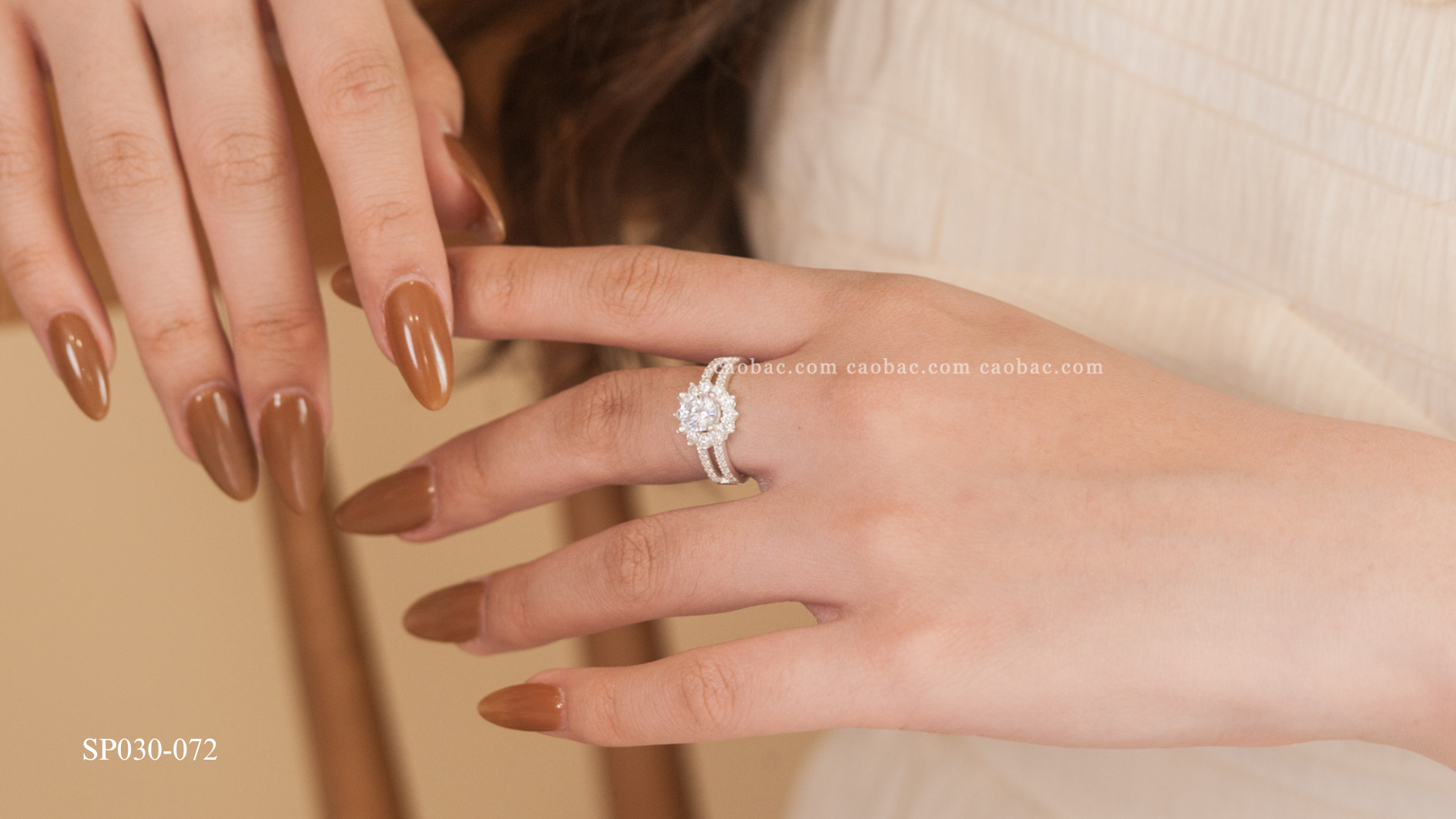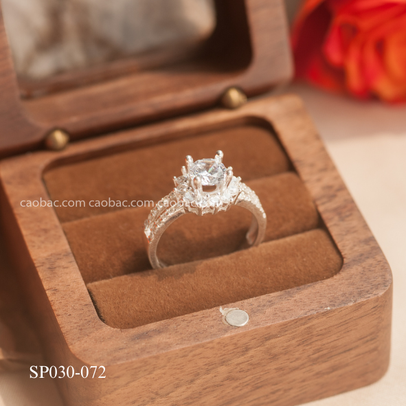 Nhẫn bạc ta ổ đá bốn chấu viền đá mặt trời cạnh hai hàng đá hở